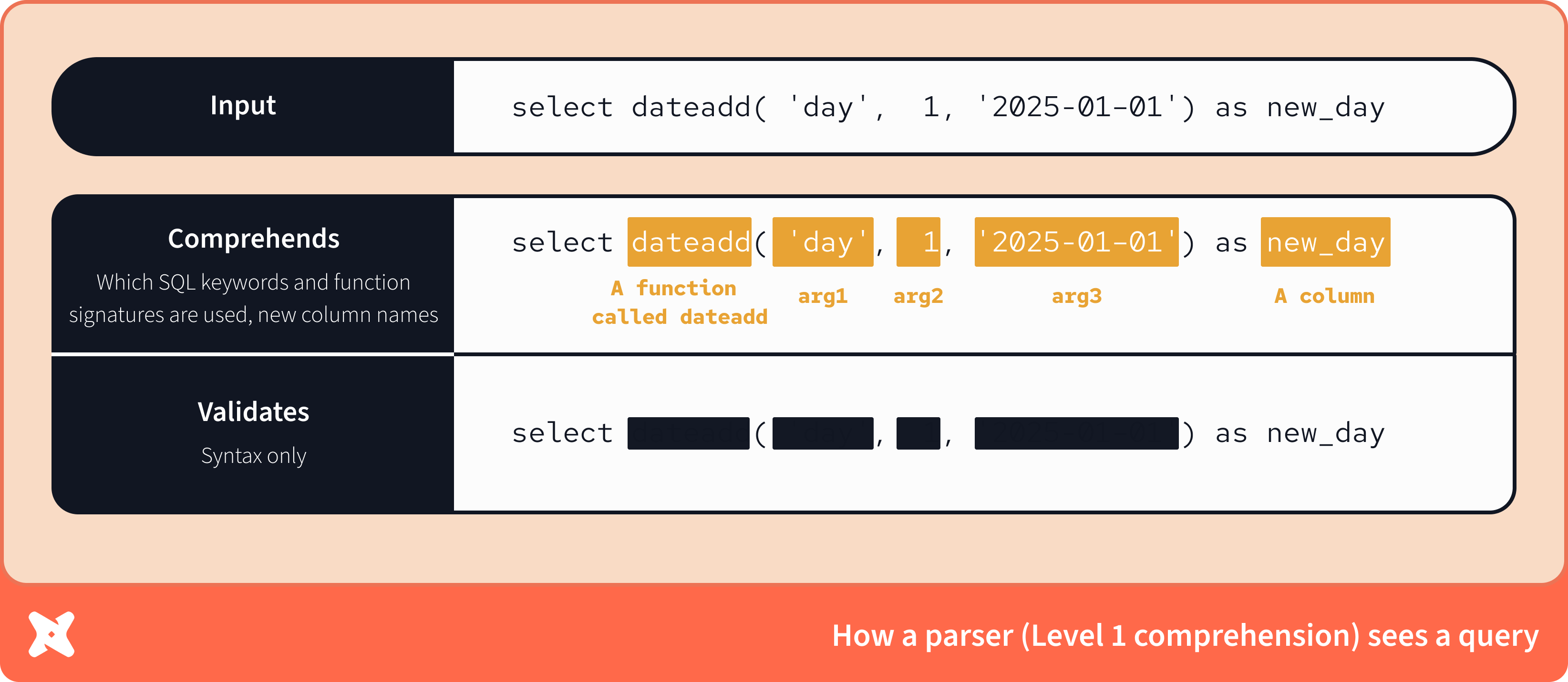 Tools that comprehend SQL can catch errors. But they can't all catch the same errors! Each subsequent level will catch more subtle errors in addition to those from all prior levels. That's because the levels are additive — each level contains and builds on the knowledge of the ones below it.
